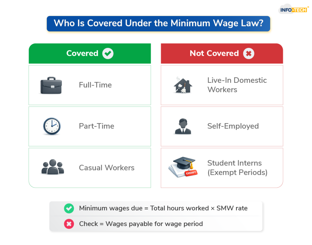 Some employees like live-in foreign domestic helpers, interns, work experience students and certain seafarers and apprentices are not covered under the law, since they are either covered by some other minimum allowable wage system, or are not considered as an employee.