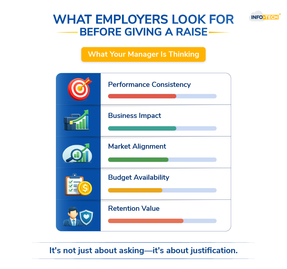 The best time is usually after you’ve delivered strong results or taken on more responsibility. Performance reviews are ideal, but not the only option. If you’ve recently completed a major project or your role has clearly expanded, that’s also a good time. Avoid asking during company downturns or budget cuts.